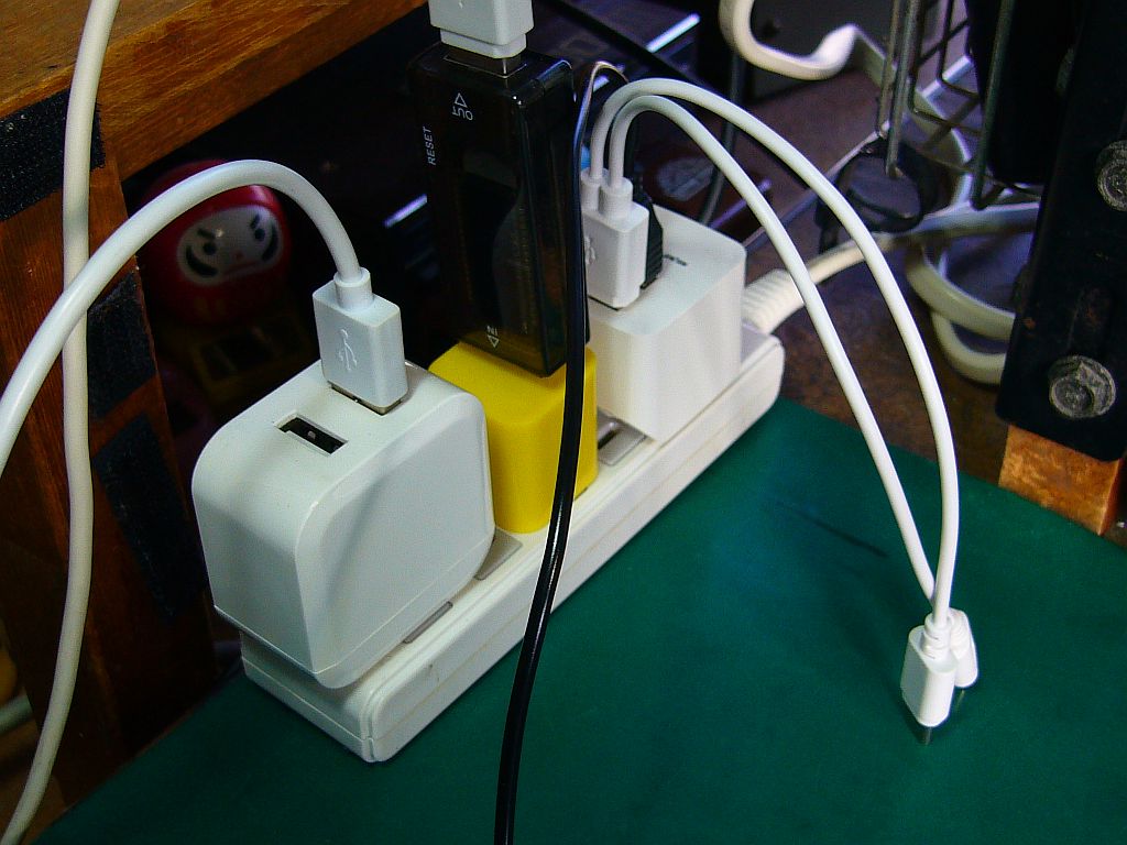 最近は、5Vで充電する小型の機器が増えて、それも一斉に充電することが多いので、雑多な5V充電器を並べているのだが、どうも見栄えが良くない。(←図2)