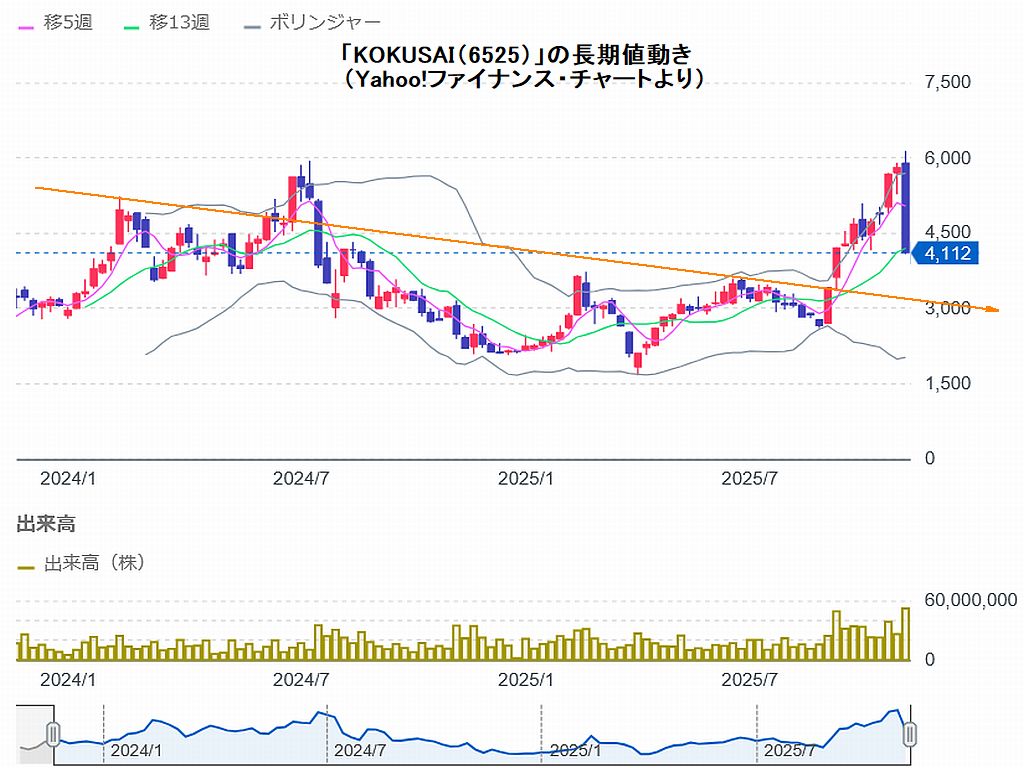 10/2、「コクサイ(6525)」の値が、再び暴騰した!(←図1 中期値動き、←図2 週間値動き)
