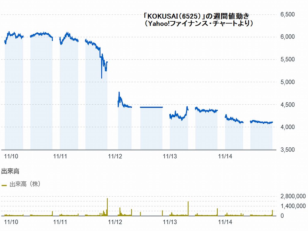 で、「コクサイエレ/KOKUSAI ELECTRIC(6525)」の株価も、11/20朝の急騰後に尻すぼみになってしまい、11/21は元の水準にまで下がってしまった。