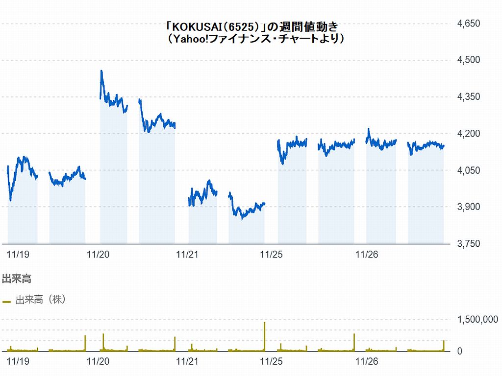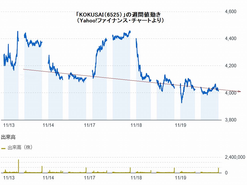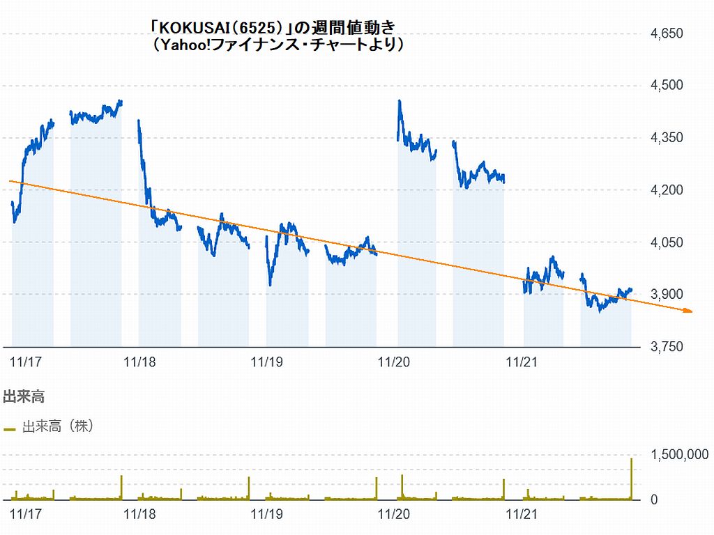 「コクサイエレ/KOKUSAI ELECTRIC(6525)」の株価は、今週は徐々に降下しているように見える。(←図1)