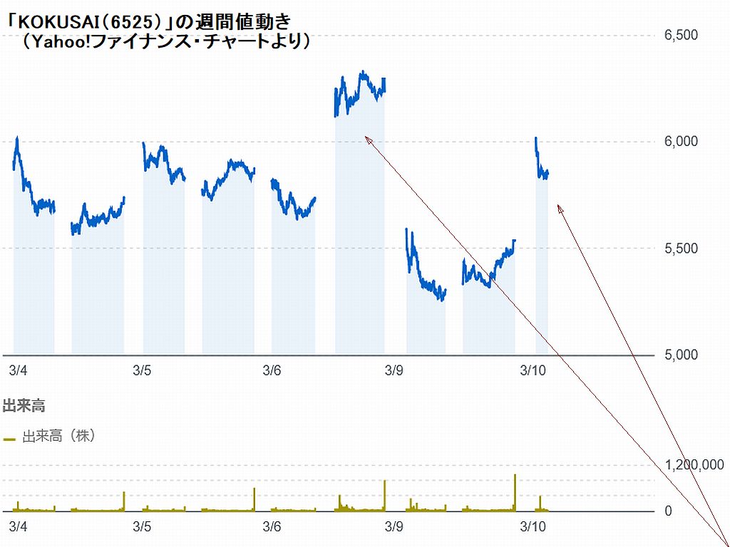 [KOKUSAI ELECTRIC(6525)]の売買で、(その上下周期と売買時期を見計らっていたにも係わらず、)もしかして、“値が、3月末迄に¥8,000を超えるかも知れない?!(損が莫大に?)”という“恐怖心”に煽られ、それに耐えられずに“売建て分”を全部、損切してしまった。(3/9迄待てば、マイナスが小さく抑えられたのに!残念!)